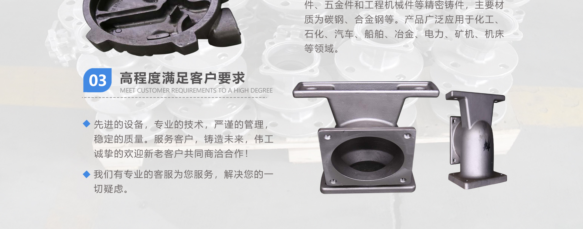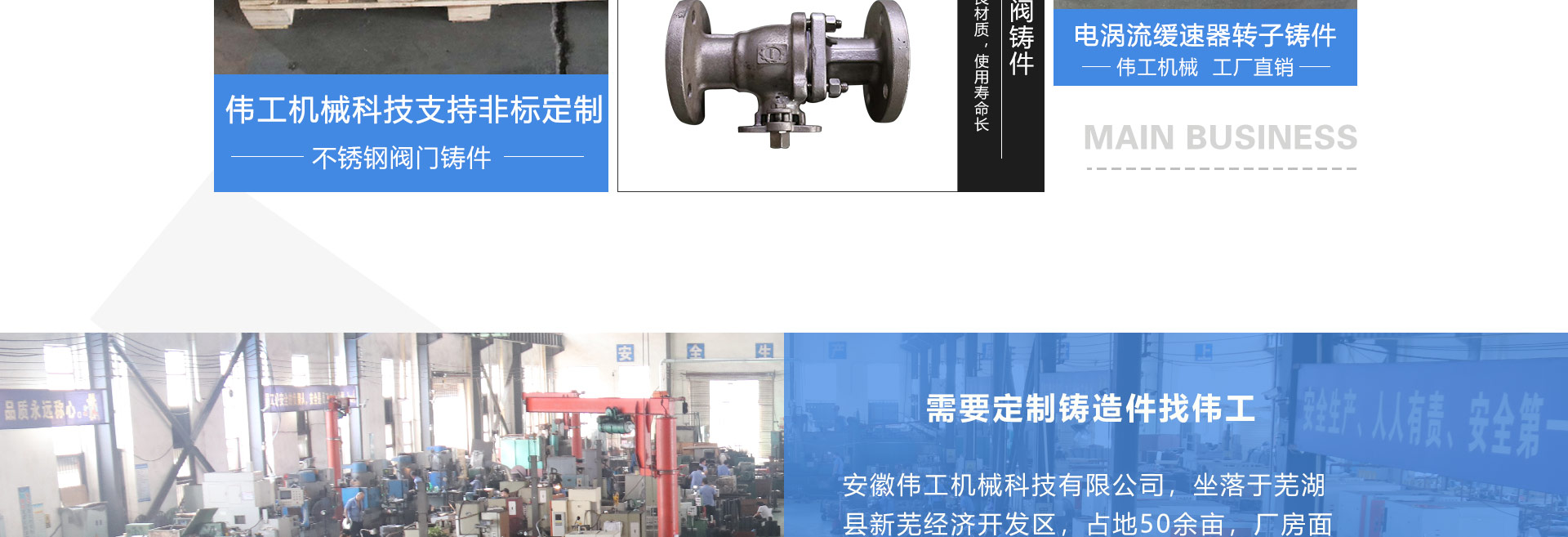 安徽偉工機械科技有限公司,坐落于安徽蕪湖新蕪經(jīng)濟開發(fā)區(qū),是一家専業(yè)從事鑄造產(chǎn)品設(shè)計、研發(fā)、生產(chǎn)、銷售于一體的企業(yè),公司為客戶的產(chǎn)品提供多樣的技術(shù)支持與設(shè)計,公司主要鑄造技術(shù)有潮模砂鑄造、硅溶膠精鑄工藝。主要產(chǎn)品有:不銹鋼閥門配件、泵閥配件、汽車配件、工業(yè)管道配件、工程機械配件、汽車配件等。材質(zhì)為:低合金鋼、304、316、316L、鉻鉬鋼、哈氏合金、碳鋼、雙相鋼等。公司已先后通過ISO9001和TS16949等多種體系審核,以完備的管理手段和齊全的檢測設(shè)備滿足客戶需求,進(jìn)的設(shè)備,専業(yè)的技術(shù),嚴(yán)謹(jǐn)?shù)墓芾恚€(wěn)定的質(zhì)量。服務(wù)客戶,鑄造未來,偉工誠摯的歡迎新老客戶共同商洽合作